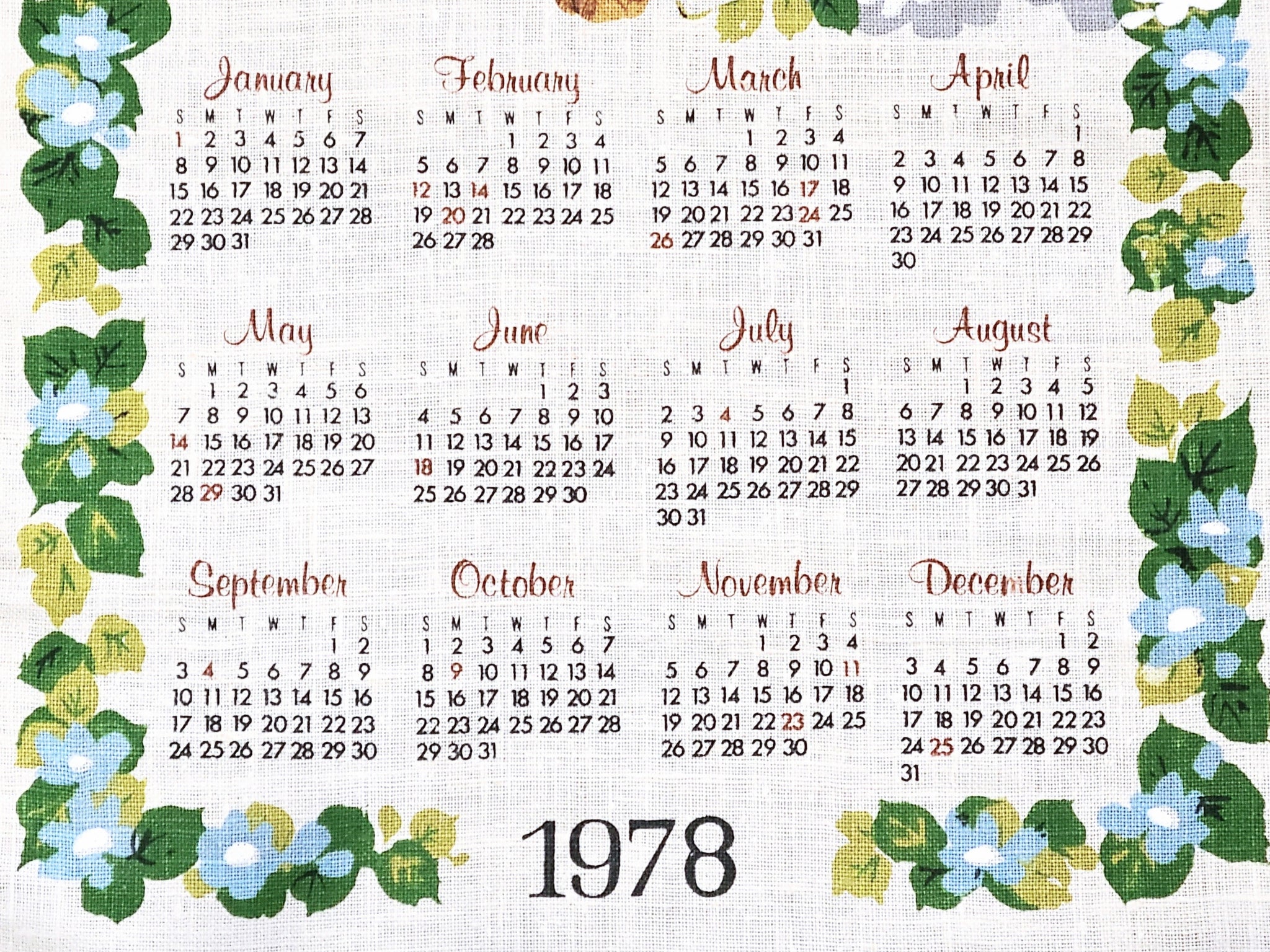 A vintage 1978 ecru linen calendar towel featuring a trio of owls surrounded by flowers